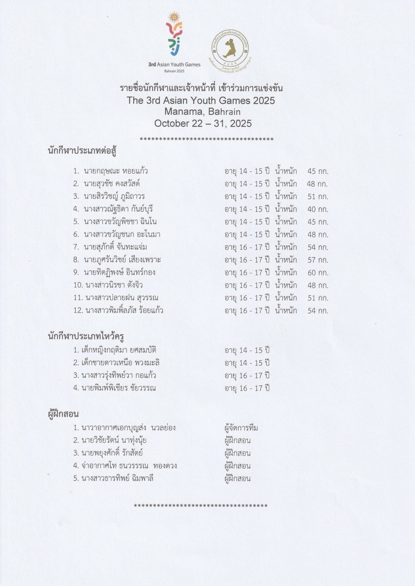 วันที่ 6 ตุลาคม 2568 องค์การบริหารส่วนจังหวัดพิษณุโลก โดยการนำของ นายมนต์ชัย วิวัฒน์ธนาฒย์ นายกองค์การบริหารส่วนจังหวัดพิษณุโลก ขอแสดงความยินดีกับนักกีฬามวยสากลและนักกีฬามวยไทยของโรงเรียนกีฬาองค์การบริหารส่วนจังหวัดพิษณุโลก ได้รับคัดเลือกจากสมาคมกีฬามวยสากลแห่งประเทศไทย เป็นตัวแทนเยาวชนทีมชาติไทยเข้าร่วมการแข่งขันกีฬาเอเชียนยูธเกมส์ ครั้งที่ 3 รายการ The 3rd Asian Youth Games – Bahrain 2025 ระหว่างวันที่ 22 – 31 ตุลาคม 2568 ณ ราชอาณาจักรบาห์เรน ประกอบด้วย