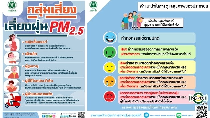 แพทย์ทหารเตือน “เด็กเล็ก ผู้สูงอายุ หญิงตั้งครรภ์ ผู้มีโรคประจำตัว เฝ้าระวังฝุ่น PM2.5” จากข้อมูลกรมควบคุมโรค กระทรวงสาธารณสุข พบว่า ปัจจุบันฝุ่น PM2.5 มีแนวโน้มเพิ่มขึ้นอย่างต่อเนื่องทั่วทั้งประเทศ และส่งผลกระทบต่อสุขภาพของประชาชนโดยเฉพาะกลุ่มเสี่ยง ได้แก่ เด็กเล็ก ผู้สูงอายุ หญิงตั้งครรภ์ และผู้ที่มีโรคประจำตัว เช่น โรคหลอดเลือดหัวใจ โรคหลอดเลือดสมอง โรคปอดอุดกั้นเรื้อรัง หอบหืด ภูมิแพ้ รวมทั้งผู้ที่ทำงานกลางแจ้ง หากได้รับฝุ่นละอองขนาดเล็กเข้าสู่ร่างกาย อาจเกิดผลกระทบต่อสุขภาพรุนแรงกว่าประชาชนทั่วไป สำหรับกลุ่มที่ควรเฝ้าสังเกตอาการผิดปกติใน 4 กลุ่มโรคสำคัญ ได้แก่ 1. กลุ่มโรคหัวใจและหลอดเลือด เช่น เหนื่อยง่าย หัวใจเต้นเร็ว 2. กลุ่มโรคระบบทางเดินหายใจ เช่น คัดจมูก น้ำมูกไหล แสบจมูกและลำคอ 3. กลุ่มโรคผิวหนังอักเสบ เช่น อาการคันหรือมีผื่นแดงตามร่างกาย และ 4. กลุ่มโรคตาอักเสบ เช่น แสบตา คันตา น้ำตาไหล และตาแดง ในการนี้ พลโท วรเทพ บุญญะ แม่ทัพภาคที่ 3/ผู้บัญชาการศูนย์บรรเทาสาธารณภัย กองทัพภาคที่ 3 และคณะแพทย์ทหาร จึงมีความห่วงใยต่อข้าราชการทหาร ในสังกัดกองทัพภาคที่ 3 และพี่น้องประชาชนในพื้นที่ 17 จัดหวัดภาคเหนือ ต่อโรคภัยดังกล่าว จึงขอให้พี่น้องประชาชนควรตรวจสอบคุณภาพอากาศในพื้นที่อย่างสม่ำเสมอ เพื่อประเมินความเสี่ยงในการสัมผัสฝุ่น PM2.5 โดยสามารถติดตามข้อมูลได้ผ่านแอปพลิเคชัน Air4Thai ของกรมควบคุมมลพิษ พร้อมขอความร่วมมือประชาชนช่วยลดการเพิ่มปริมาณ ฝุ่นละอองในอากาศ เช่น ลดการใช้รถยนต์ งดการเผาขยะ ดูแลทำความสะอาดบ้านให้ปลอดฝุ่น ปิดประตูหน้าต่างให้มิดชิด และหลีกเลี่ยงการออกนอกอาคารหรือทำกิจกรรมนอกบ้านโดยไม่จำเป็น โดยเฉพาะการทำงานกลางแจ้ง หรือการออกกำลังกายในพื้นที่ที่มีฝุ่นหนาแน่น และหากมีความจำเป็นต้องออกนอกบ้าน ควรป้องกันตนเองด้วยการสวมหน้ากากป้องกันฝุ่นละอองขนาดเล็ก โดยเฉพาะผู้ใช้รถจักรยานยนต์ ควรสวมหน้ากาก แว่นตา และเสื้อแขนยาว เพื่อป้องกันการระคายเคืองต่อดวงตาและผิวหนัง ทั้งนี้ หากมีอาการผิดปกติ หรือสงสัยว่ามีผลกระทบจากฝุ่น ควรรีบไปพบแพทย์โดยเร็ว ได้ที่โรงพยาบาลทหารทั้ง 10 แห่งในพื้นที่ภาคเหนือ จึงขอเรียนให้พี่น้องประชาชน ในพื้นที่ 17 จังหวัดภาคเหนือทราบ เพื่อให้เกิดความมั่นใจได้ว่า กองทัพภาคที่ 3 โดย โรงพยาบาลทหารทั้ง 10 แห่งในพื้นที่ภาคเหนือ พร้อมที่จะให้การช่วยเหลือประชาชน ในยามวิกฤตทุกโอกาส