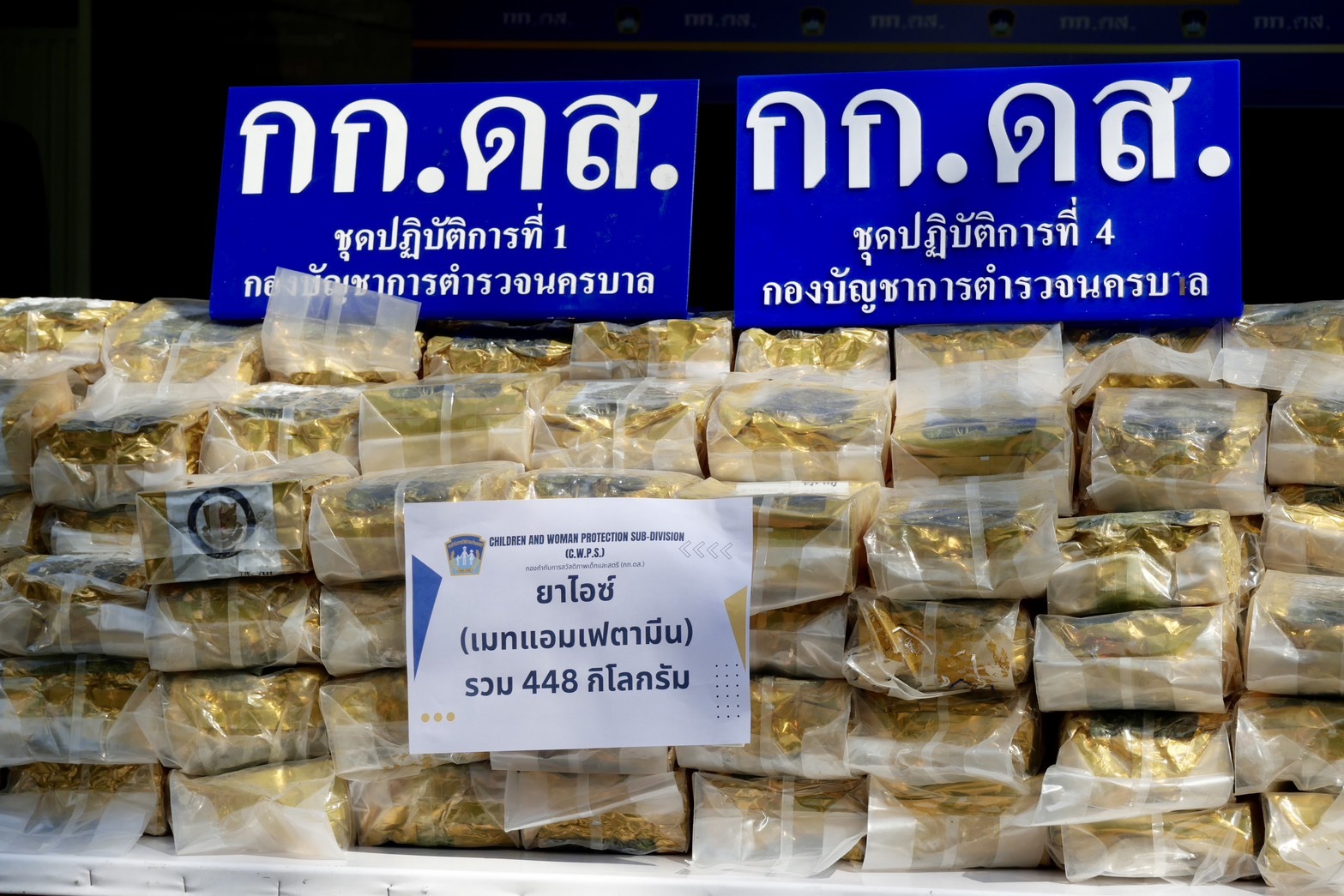 วันนี้(จันทร์ ที่ 23 ก.พ.69) เวลา 15.00 น. พล.ต.ท.สยาม บุญสม ผบช.น. พร้อมด้วย พล.ต.ต.ธีรเดช ธรรมสุธีร์ รอง ผบช.น., พ.ต.อ.ศุภชัย ชัยสุรรณ ผกก.ดส. และเจ้าหน้าที่ตำรวจ กก.ดส. ร่วมแถลงข่าวผลการจับกุม นายสมชาย ฯ อายุ 55 ปี และ นายปรีดา ฯอายุ 54 ปี โดยกล่าวหาว่า “ร่วมกันจำหน่าย โดยการมีไว้เพื่อจำหน่าย ซึ่งยาเสพติดให้โทษประเภท 1 (ยาไอซ์หรือเมทแอมเฟตามีน) โดยไม่ได้รับอนุญาต“ พร้อมตรวจยึดของกลาง ยาเสพติดให้โทษประเภท 1 (เมทแอมเฟตามีนหรือยาไอซ์) จำนวน 23 กระสอบ จำนวน 448 ห่อ น้ำหนักประมาณ 448 กิโลกรัม และ รถยนต์ของกลาง จำนวน 2 คัน ณ ลานอเนกประสงค์ กก.ดส.