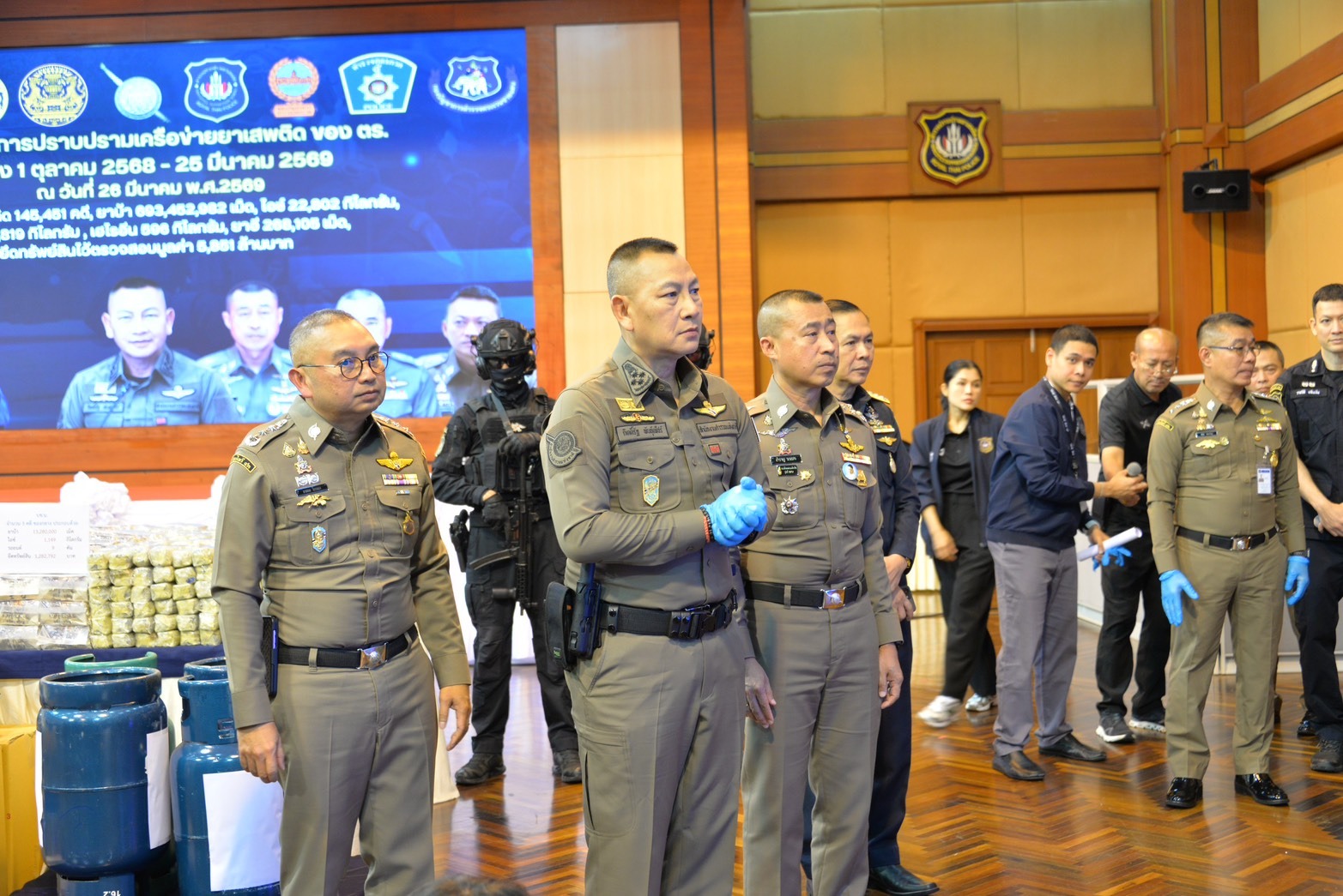 ผบ.ตร. แถลงผลการปราบปรามเครือข่ายยาเสพติดของสำนักงานตำรวจแห่งชาติ รอบ 6 เดือน จับกุม 145,541 คดี ยึดยาบ้าเกือบ 700 ล้านเม็ดตามนโยบายของรัฐบาล ภายใต้การนำของ นายอนุทิน ชาญวีรกูล นายกรัฐมนตรี และสำนักงานตำรวจแห่งชาติ ภายใต้การนำของ พล.ต.อ.กิตติ์รัฐ พันธุ์เพ็ชร์ ผู้บัญชาการตำรวจแห่งชาติ (ผบ.ตร.), พล.ต.อ.สำราญ นวลมา รอง ผบ.ตร. ในฐานะผู้อำนวยการศูนย์อำนวยการป้องกันและปราบปรามยาเสพติด สำนักงานตำรวจแห่งชาติ (ผอ.ศอ.ปส.ตร.), พล.ต.ท.สมประสงค์ เย็นท้วม ผู้ช่วย ผบ.ตร./รอง ผอ.ศอ.ปส.ตร. และ พล.ต.ท.กฤษฎา กาญจนอลงกรณ์ ผู้ช่วย ผบ.ตร./รอง ผอ.ศอ.ปส.ตร. โดยศูนย์อำนวยการป้องกันและปราบปรามยาเสพติด สำนักงานตำรวจแห่งชาติ (ศอ.ปส.ตร.) ได้ขับเคลื่อนการปฏิบัติการเชิงรุกในทุกมิติ ทั้งการสืบสวน ขยายผล ปราบปรามเครือข่ายยาเสพติดทั้งภายในประเทศและต่างประเทศ พร้อมยึดทรัพย์สินที่เกี่ยวข้อง เพื่อตัดวงจรทางการเงินของขบวนการค้ายาเสพติดอย่างเด็ดขาดวันนี้ (26 มีนาคม 2569) เวลา 14.00 น. พล.ต.อ.กิตติ์รัฐ พันธุ์เพ็ชร์ ผู้บัญชาการตำรวจแห่งชาติ (ผบ.ตร.) เป็นประธานการแถลงผลการปฏิบัติปราบปรามเครือข่ายยาเสพติดของสำนักงานตำรวจแห่งชาติ (ห้วงวันที่ 1 ตุลาคม 2568 – 25 มีนาคม 2569) ที่กองบัญชาการตำรวจปราบปรามยาเสพติด (บช.ปส.) โดยมี พล.ต.อ.สำราญ นวลมา รอง ผบ.ตร./ผอ.ศอ.ปส.ตร., พล.ต.ท.อาชยน ไกรทอง ผบช.ปส., พล.ต.ท.สยาม บุญสม ผบช.น., พล.ต.ท.กฤตธาพล ยี่สาคร ผบช.ภ.5, พล.ต.ต.ธีรเดช ธรรมสุธีร์ รอง ผบช.น./รอง โฆษก ตร., ผู้แทน บช.ตชด., ผู้แทน สำนักงาน ป.ป.ส. และ ผู้แทน กอ.รมน. โดยบูรณาการทุกหน่วยที่เกี่ยวข้อง เพื่อ “ตัดต้นทาง–ตัดเส้นทาง–ตัดปลายทาง” พร้อมยึดทรัพย์เครือข่ายผู้กระทำผิดอย่างเป็นรูปธรรม สำนักงานตำรวจแห่งชาติได้ดำเนินการบูรณาการกำลังร่วมกับหน่วยงานที่เกี่ยวข้องอย่างเข้มข้น ระหว่างวันที่ 1 ตุลาคม 2568 – 25 มีนาคม 2569 เพื่อขับเคลื่อนมาตรการปราบปรามยาเสพติดในทุกมิติ ส่งผลให้สามารถจับกุมคดีเกี่ยวกับยาเสพติดได้จำนวน 145,541 คดี พร้อมทั้งตรวจยึดของกลางจำนวนมาก ได้แก่ ยาบ้า 693,452,982 เม็ด, ไอซ์ 22,802.39 กิโลกรัม, เฮโรอีน 596.92 กิโลกรัม, คีตามีน 3,819.07 กิโลกรัม, ยาอี 268,105 เม็ด, และอายัดทรัพย์สินที่เกี่ยวเนื่องกับการกระทำความผิดรวมมูลค่ากว่า 5,851 ล้านบาทกองบัญชาการตำรวจปราบปรามยาเสพติด (บช.ปส.) มีผลการปฏิบัติระหว่างวันที่ 1 ตุลาคม 2568 – 25 มีนาคม 2569 จับกุมคดีเกี่ยวกับยาเสพติดได้จำนวน 650 คดี พร้อมของกลางยาเสพติด ได้แก่ ยาบ้า 184,112,615 เม็ด, ไอซ์ 6,669.70 กิโลกรัม, คีตามีน 659.38, เฮโรอีน 313.21 กิโลกรัม, ยาอี 106,390 เม็ด และอายัดทรัพย์สินที่เกี่ยวเนื่องกับการกระทำความผิดรวมมูลค่ากว่า 1,707 ล้านบาท 