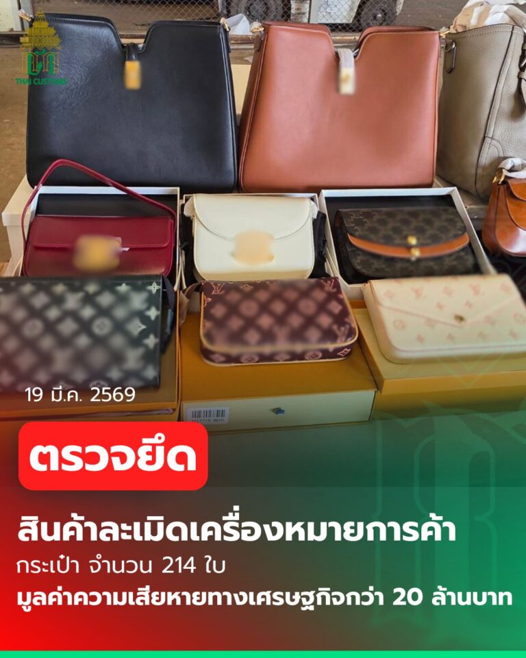 กรมศุลกากร ตรวจยึด “กระเป๋า ละเมิดเครื่องหมายการค้า เมืองกำเนิดต่างประเทศ” มูลค่าความเสียหายทางเศรษฐกิจกว่า 20 ล้านบาท